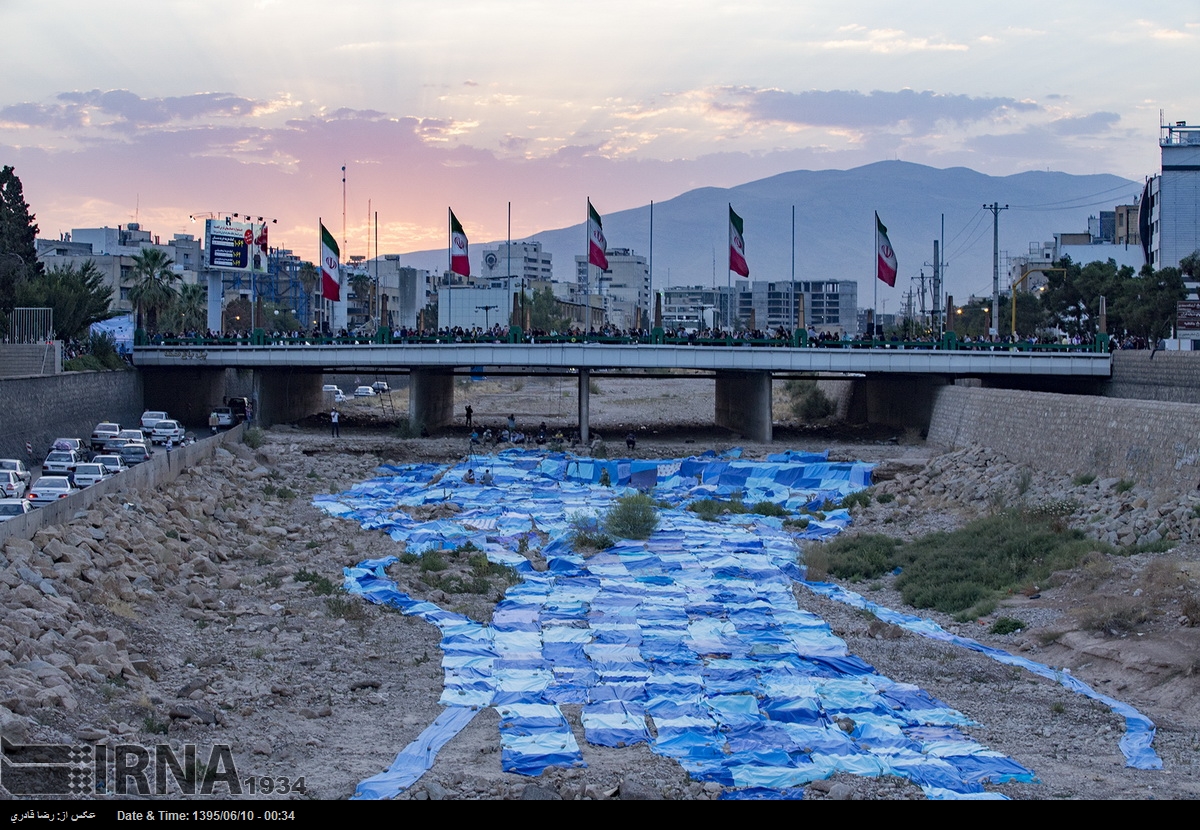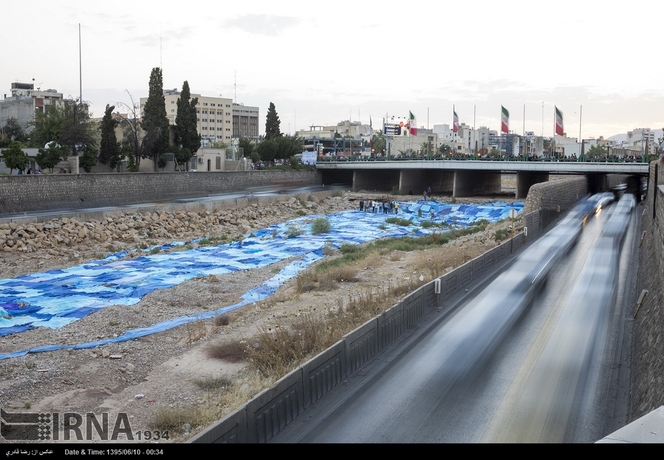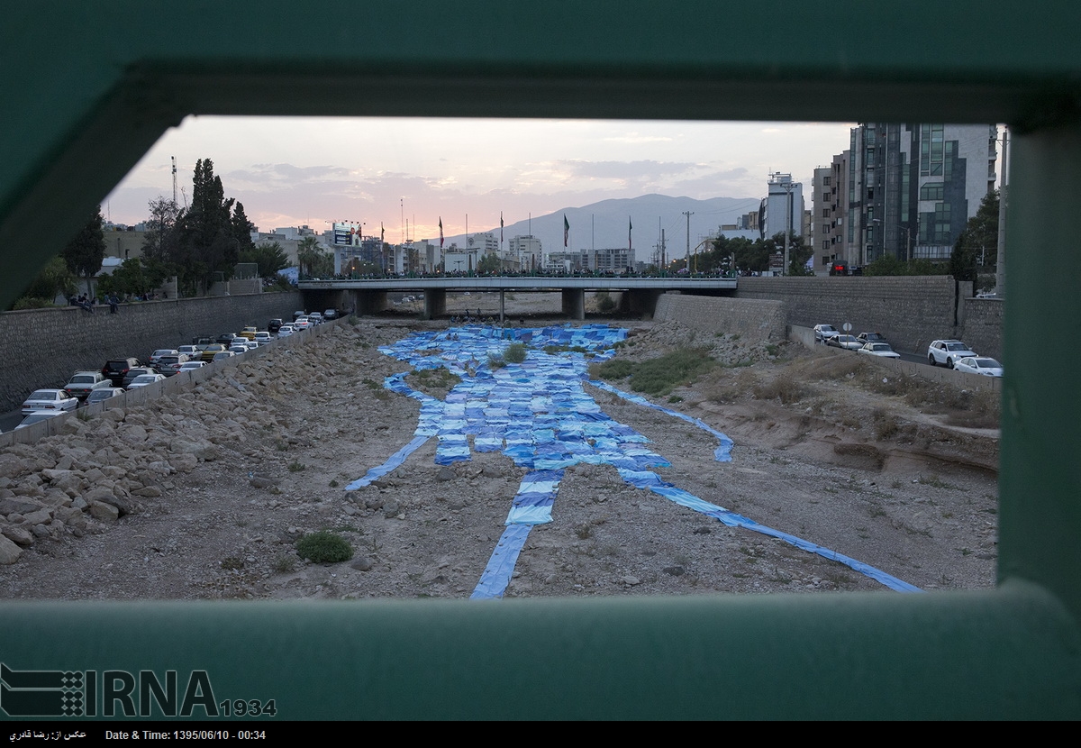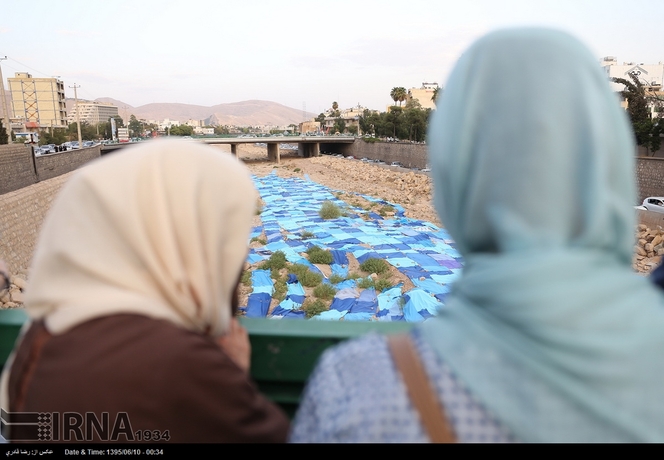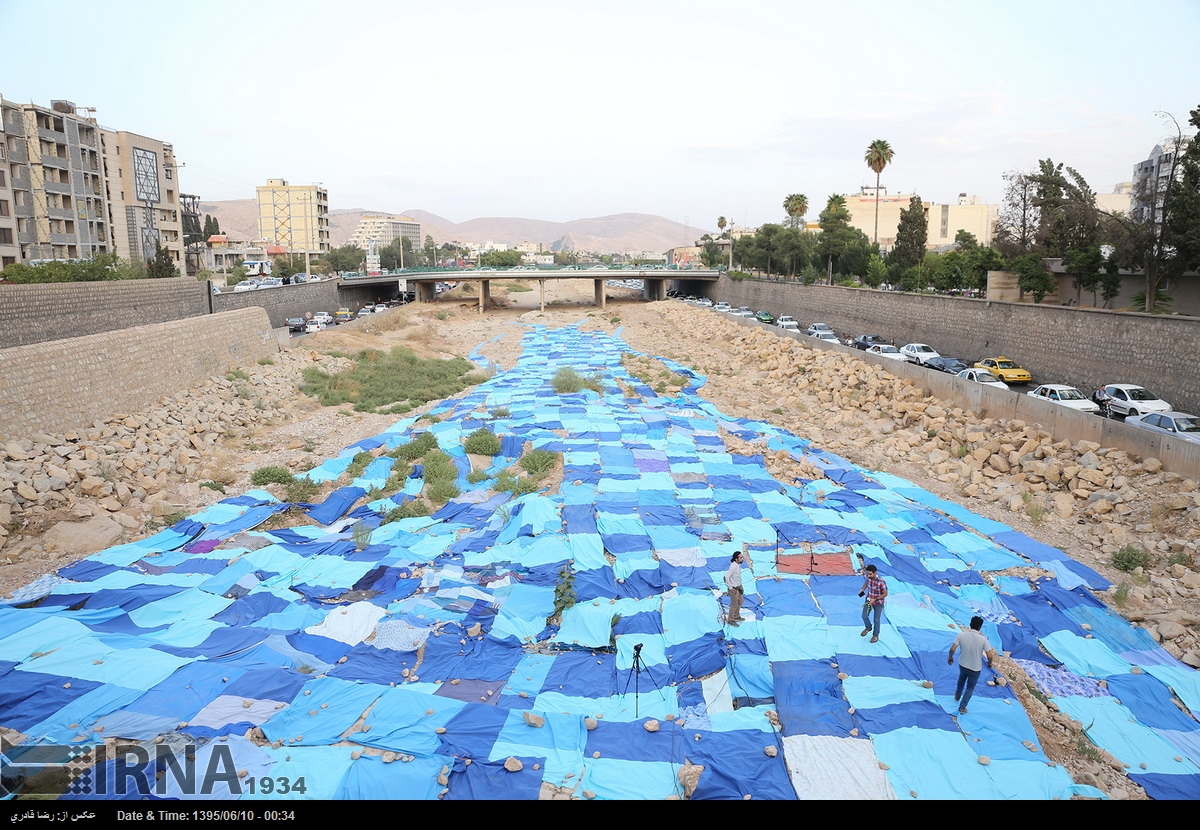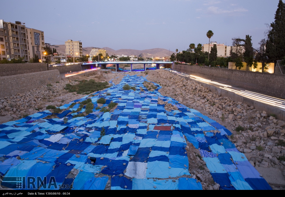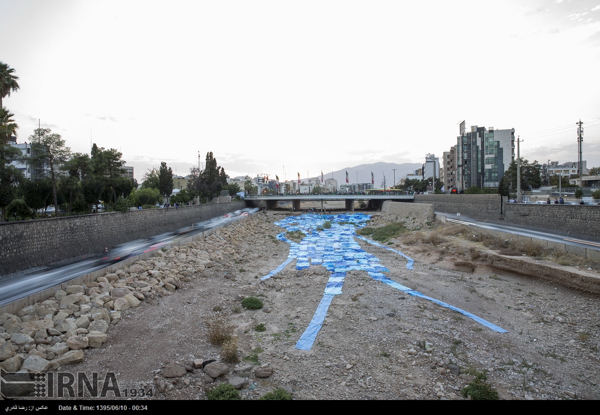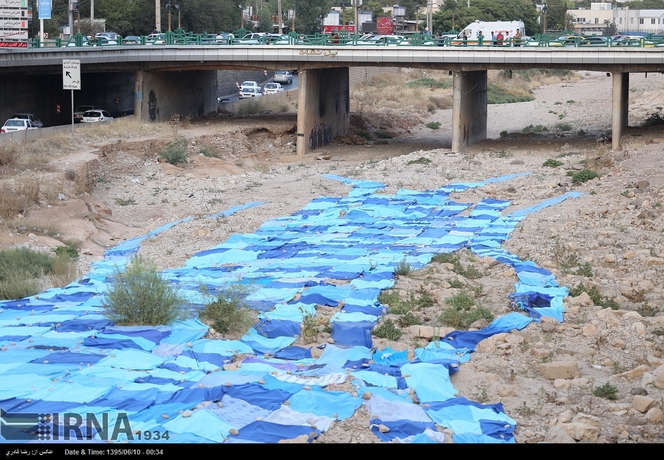بستر رودخانه خشک شیراز که سال هاست آبی در آن جاری نیست روز سه شنبه با ابتکار گروهی از هنرمندان نگران از بحران آب با پارچه های آبی به رنگ آبی آب در آمد.*