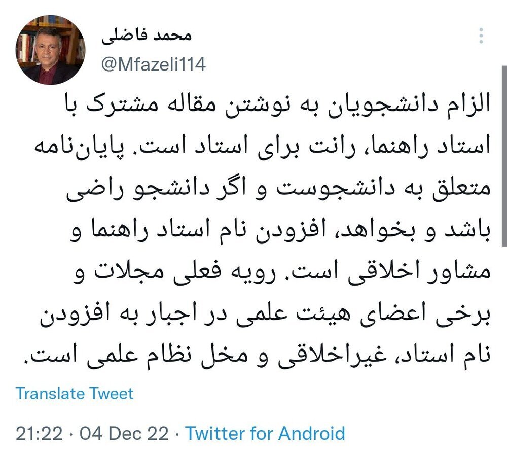 این استاد دانشگاه در ادامه توئیت خود نوشت که «پایاننامه متعلق به دانشجوست و اگر دانشجو راضی باشد و بخواهد، افزودن نام استاد راهنما و مشاور اخلاقی است. رویه فعلی مجلات و برخی اعضای هیات علمی در اجبار به افزودن نام استاد، غیراخلاقی و مخل نظام علمی است.»