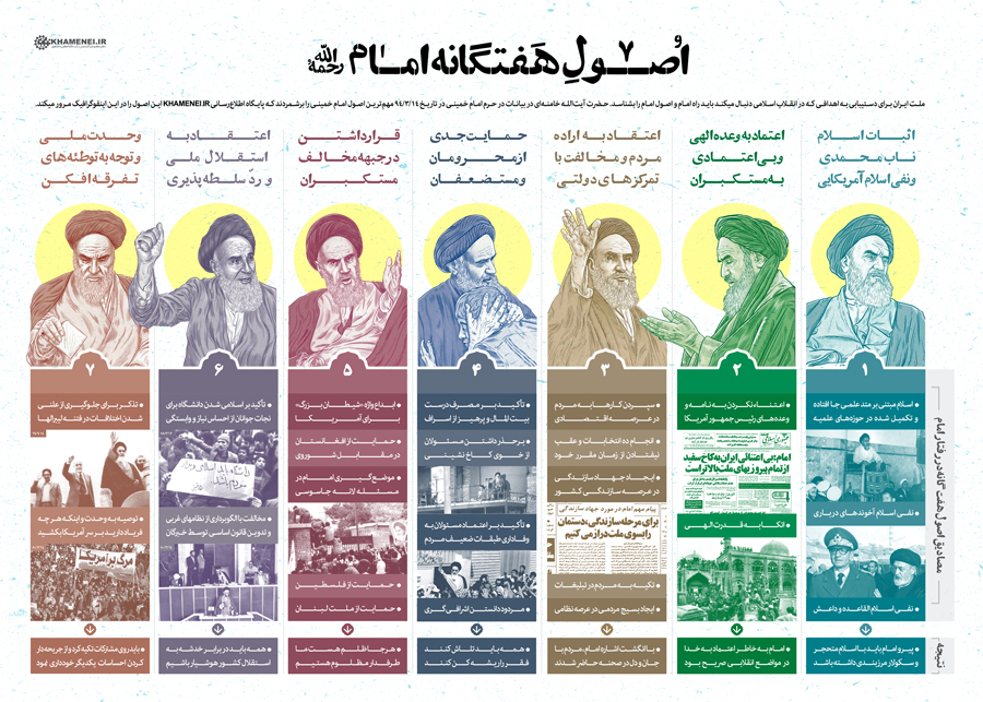 خبرنامه دانشجویان ایران: حضرت آیتالله خامنهای در بیانات در حرم امام خمینی (ره) در تاریخ ۹۴/۳/۱۴ مهمترین اصول امام خمینی را برشمردند که پایگاه اطلاعرسانی KHAMENEI.IR این اصول را در این اینفوگرافیک مرور میکند.