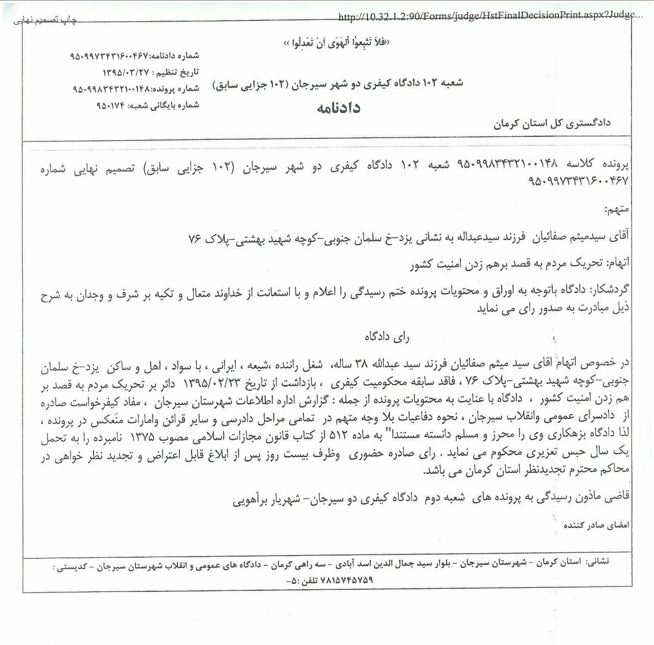 برخی از رانندگان در گفت و گو با «تابناک» اعلام کردند: « صفائیان معقتد بود، اگرچه فساد در پایانه های باربری بندرعباس بیداد می کند ولی اگر رانندگان با هم متحد باشند، توان مقابله با این قانون شکنی را خواهند داشت.» این راننده معترض به همکاران معترضش گفته بود: «خداوند به من نعمت زبان، قلم و فکر، و انقلابی بودن و حمایت چندین هزار راننده را داده است. پس چگونه می توانم این همه ظرفیت برای مبارزه با فساد را رها کرده و پی کارم بروم؟ جواب خدا را چه خواهم داد؟ اگر بتوانم قدمی در راه مبارزه با فساد بردارم و نکنم؟ اگر از بازداشت های چند روزه و زندان های چند ماهه یا چند ساله بترسم و جلوی فساد نایستم، جواب شهدا و اسرای جنگ تحمیلی را در قیامت چه بدهم؟» با این وجود حدس اين راننده جوان درست بوده است و ادامه اعتراضات رانندگان سبب می شود تا «سید ميثم صفائیان» که نمایندگی آنها را داشت بازداشت و در تاریخ 10 تیر به یک سال حبس محکوم شود.